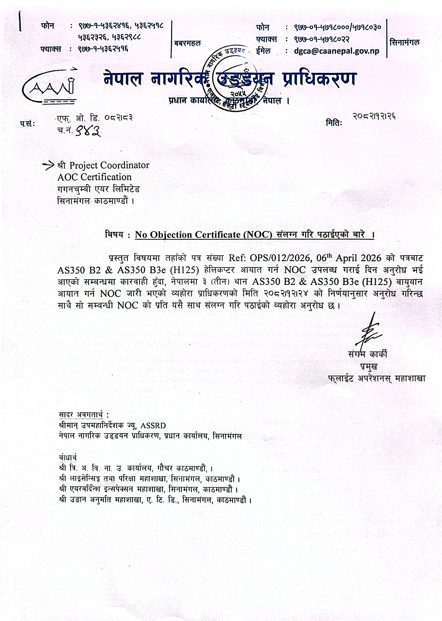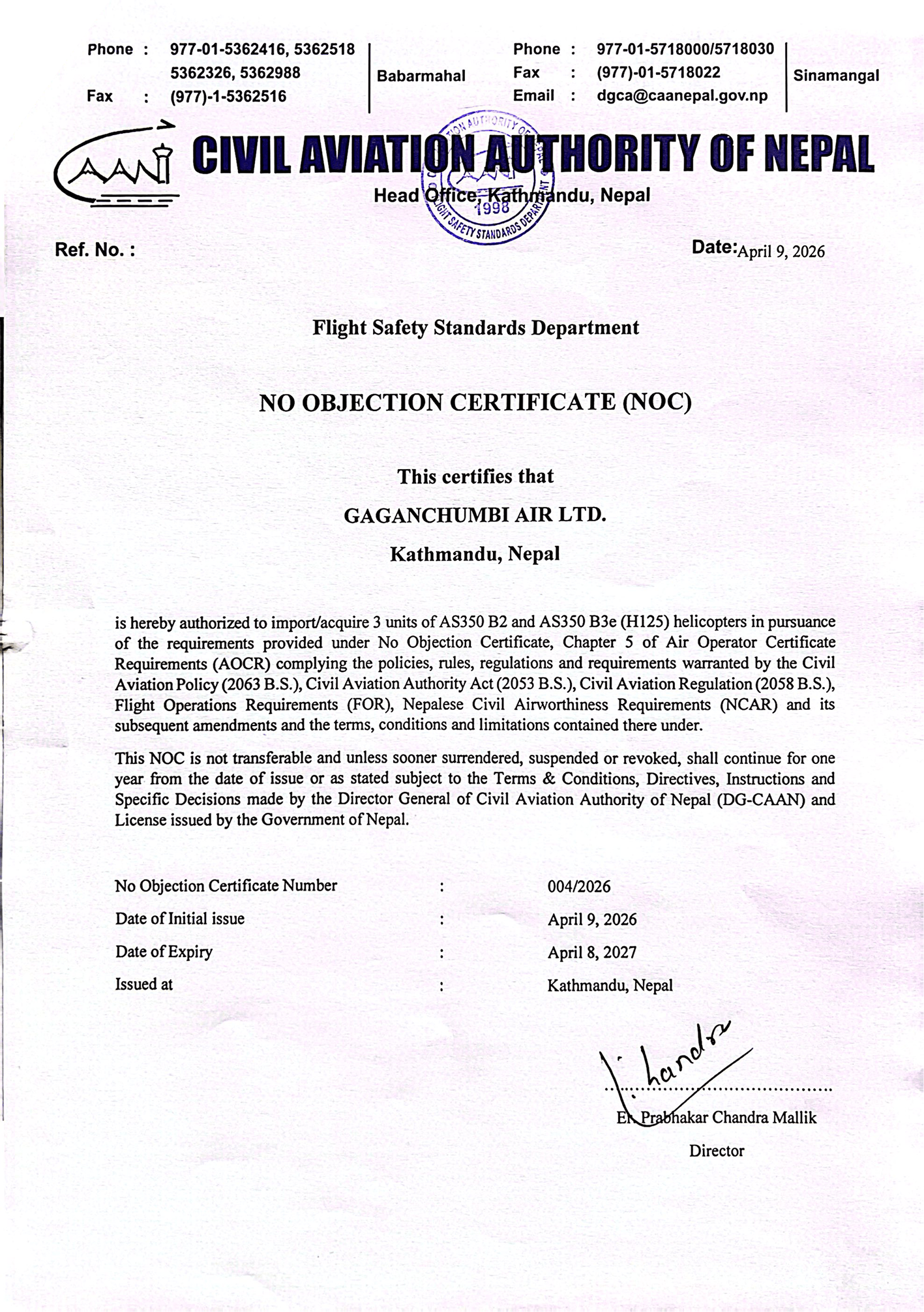 Gaganchumbi air limited is first public aviation company founded by young energetic and dynamic aviators .It has been registered in the office of company register under the registration number 312191/80/081 in 2080/01/25BS. We are domestic air operator in Nepal that provides top quality safe reliable and comfortable air schedule, charter services and cargo service in a competitive self sustainable and profitable manner. We are committed to deliver unparalleled aerial transportation solutions to our clients globally through a commitment to safety reliability and customer satisfaction.